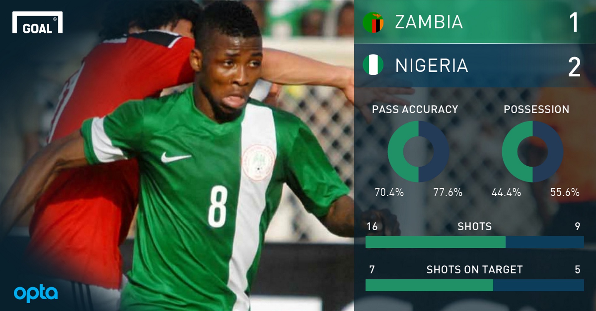 First, and most obviously, Iwobi opened the scoring with a well-executed volley from inside the box. However, his worth to this team in terms of transitioning the ball was apparent; whereas Moses carried the ball at pace against Tanzania and sparred with the full-back, the Arsenal man came inside often and sought to combine with Mikel John Obi and Kelechi Iheanacho in advanced positions.